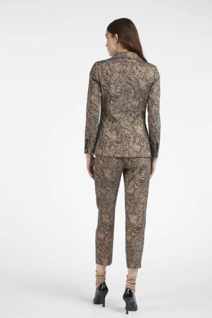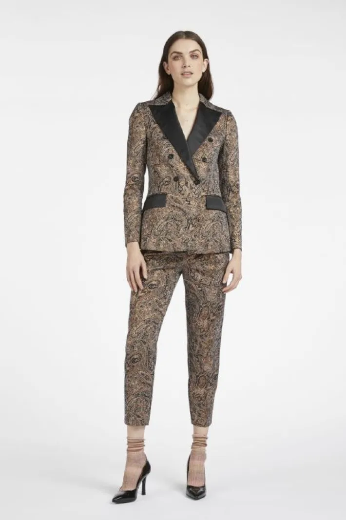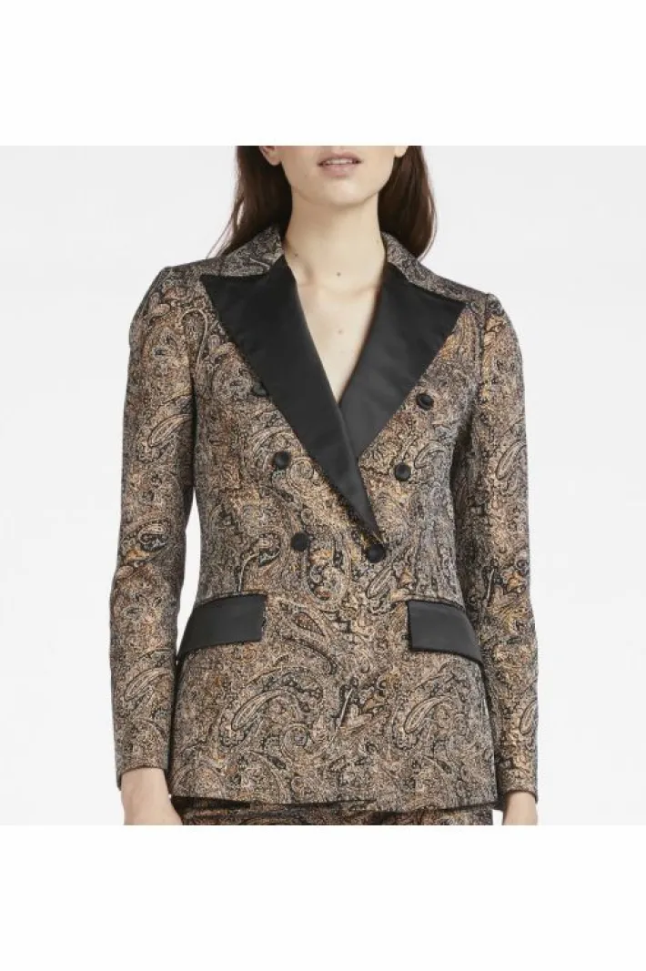 Elegante giacca doppiopetto realizzata in un prezioso tessuto jacquard con dettagli (bottoni, rever e tasche) di raso