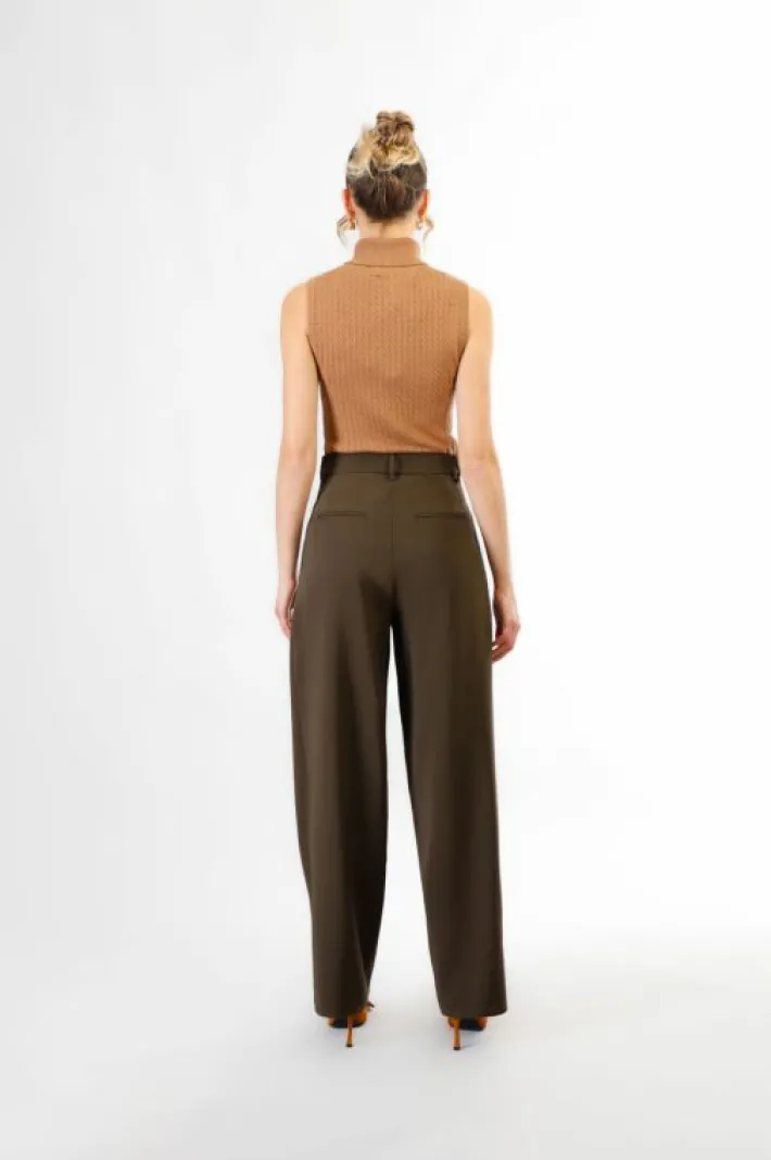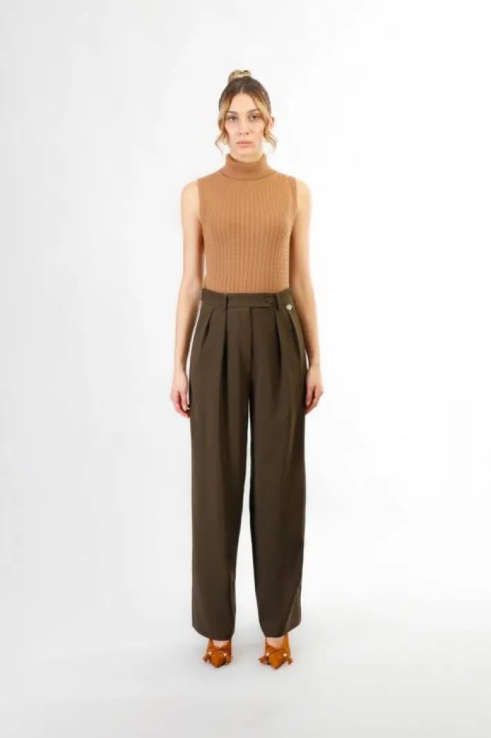 Pantaloni modello a gamba dritta ampia con pieghe davanti e vita leggermente alta realizzato in tessuto bistretch. vita con passanti e chiusura con zip e bottone. il capo ideale per realizzare look sporty chic grazie alla combinazione tra comodità ed eleganza che rende il capo sempre alla moda.