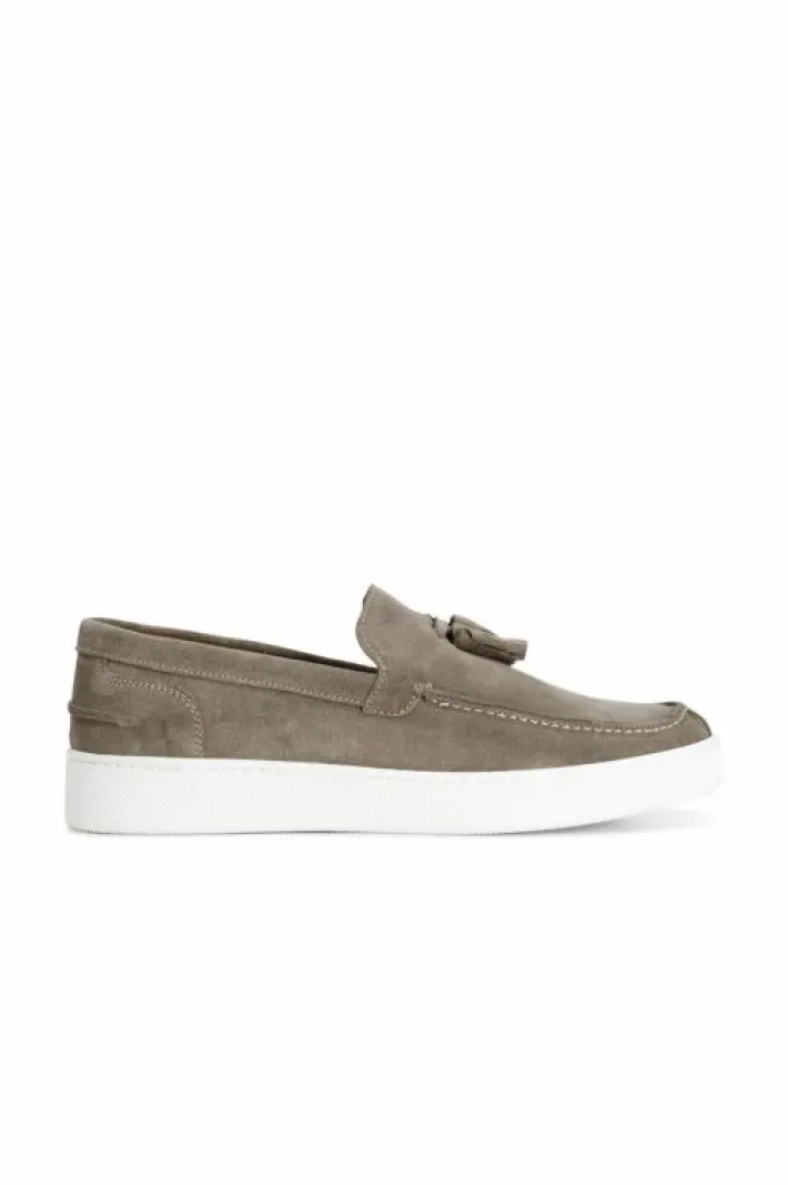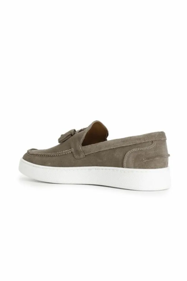 Mocassini uomo con nappine in pelle scamosciata. soletto in pelle. suola a cassetta.