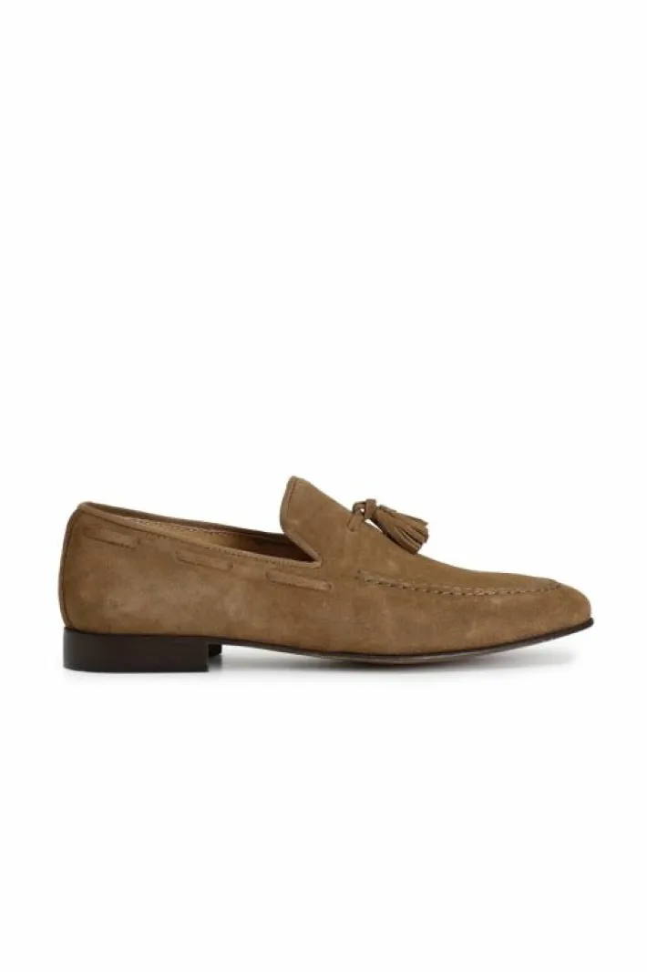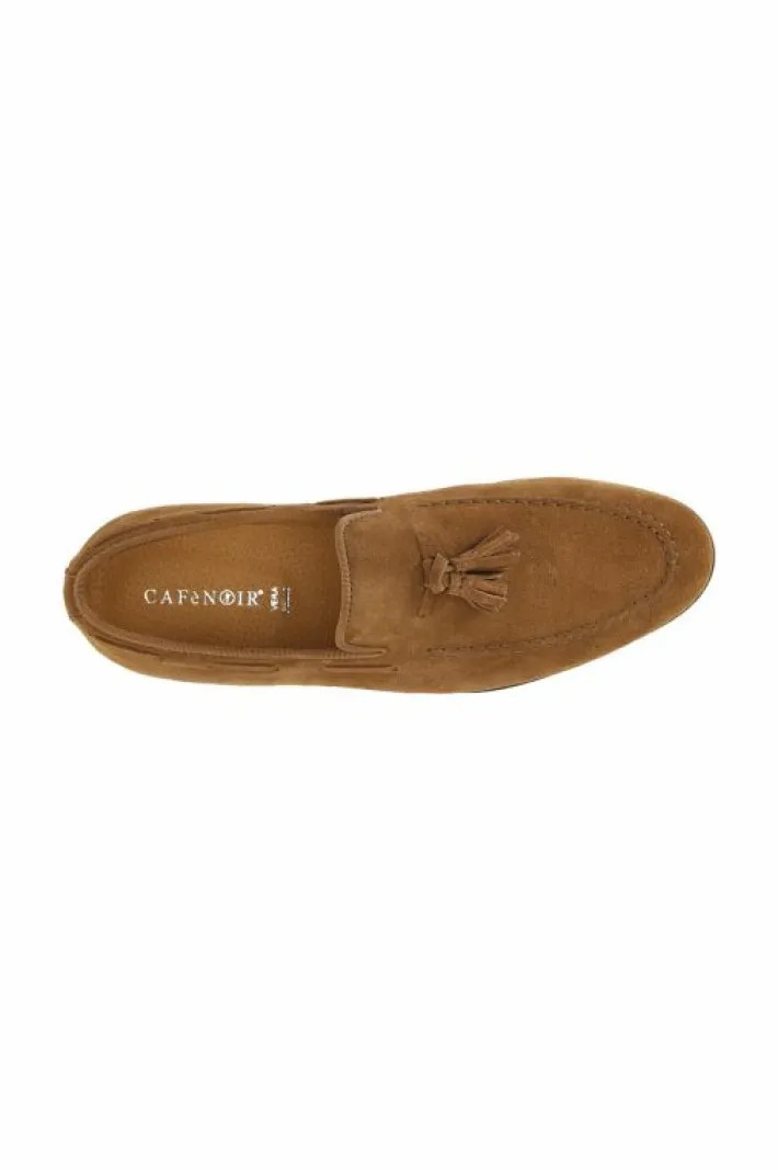 Mocassini uomo con nappine in pelle scamosciata. soletto in pelle. suola in cuoio.