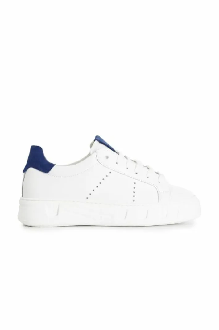 Sneakers allacciate uomo in pelle bianca con colletto blu. soletto in pelle.